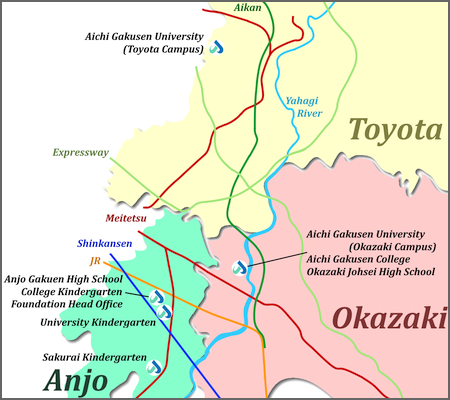 학교 법인 안성 학원은 아이치 현의 안성, 오카자키, 도요타의 세 도시에 걸쳐 미카와 지역의 종합적인 학교입니다. 우리는 유치원, 고등학교, 단기대학와 대학이 있습니다.